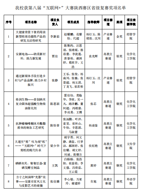 9月13日,陕西省教育厅发布了《关于公布第八届中国国际“互联网+”大学生创新创业大赛陕西赛区获奖名单的通知》,我校共有17个作品获奖,其中,产业赛道获得金奖1项、银奖1项、铜奖2项;高教主赛道获得银奖1项、铜奖8项;“青年红色筑梦之旅”赛道获得铜奖4项;创我校参加“互联网+”大赛省赛开赛以来获奖数量上的最好成绩,并取得了金奖突破。